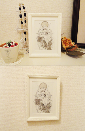 上記のように棚置きも壁掛けもできる額に入れた状態でお渡しになます。